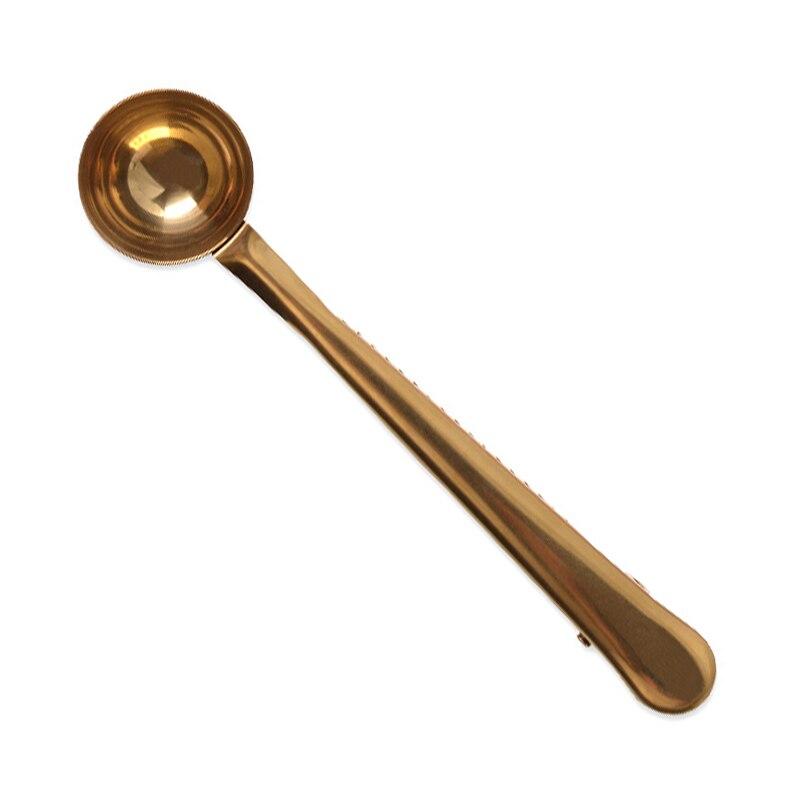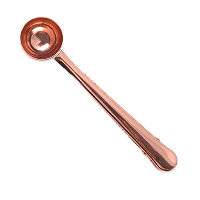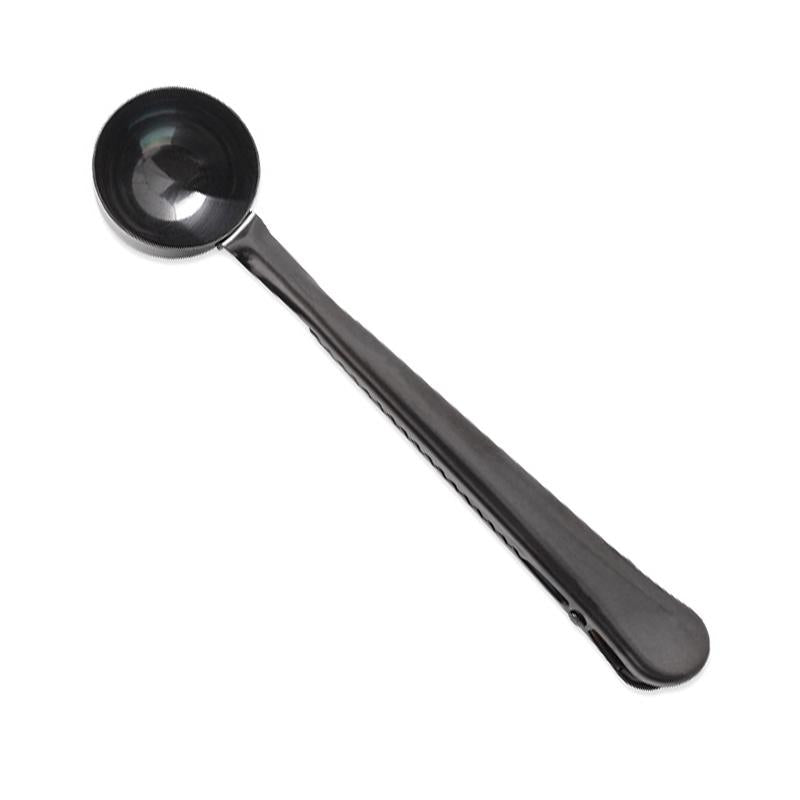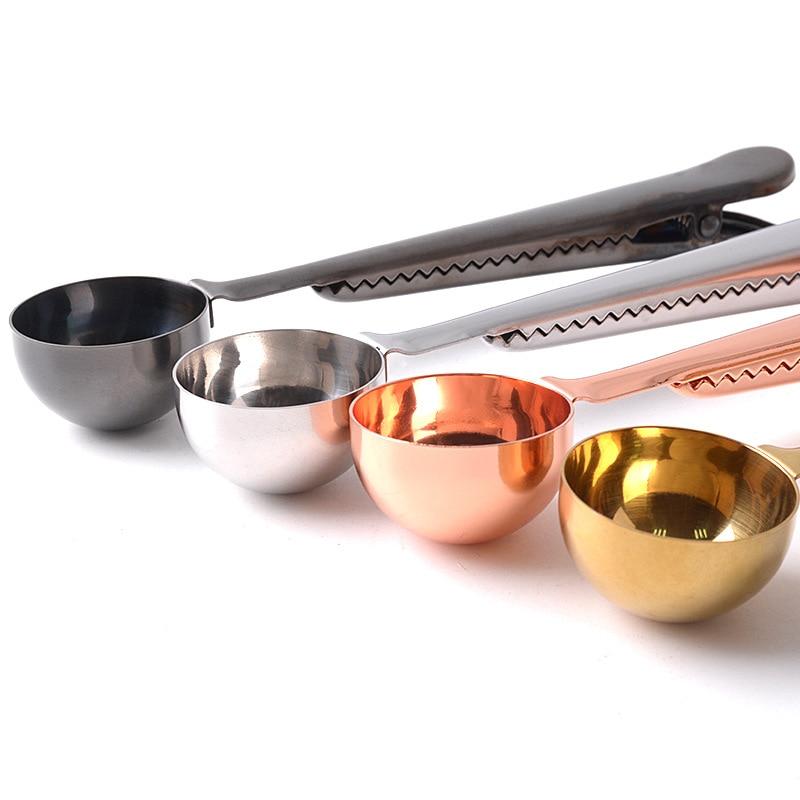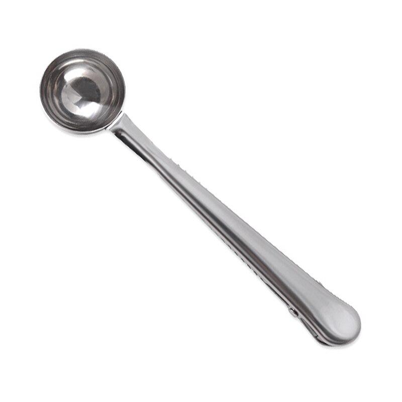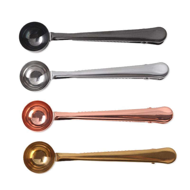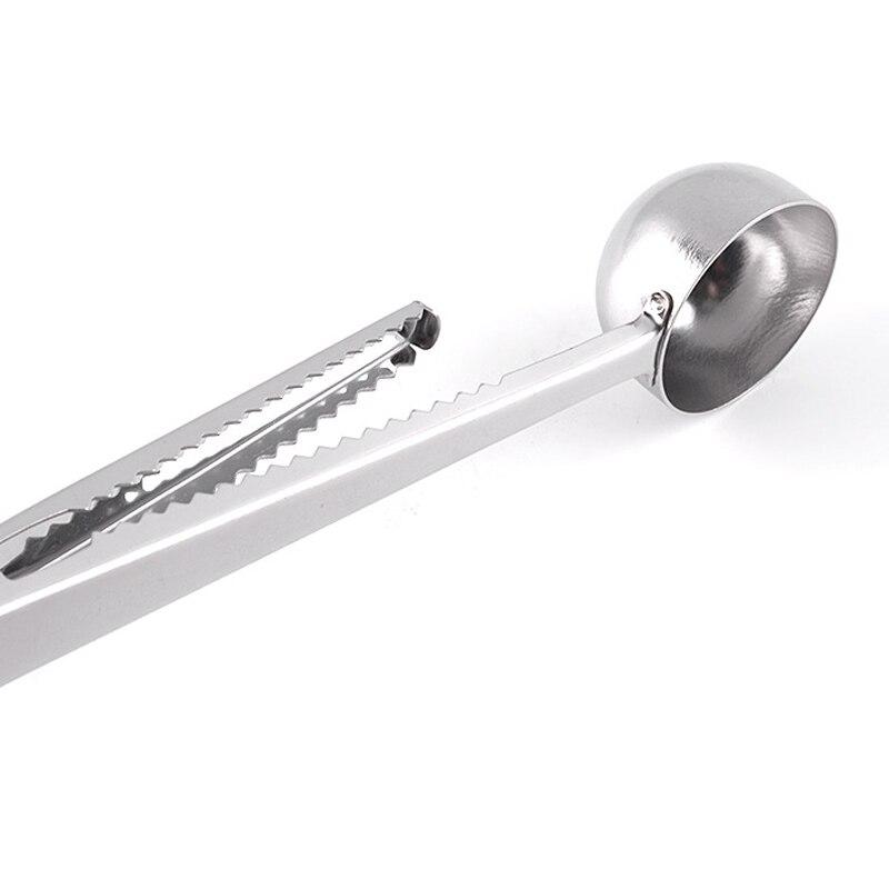 Colher de medição multi uso diferenciada em aço inoxidável com clipe pra ser colocado na embalagem.