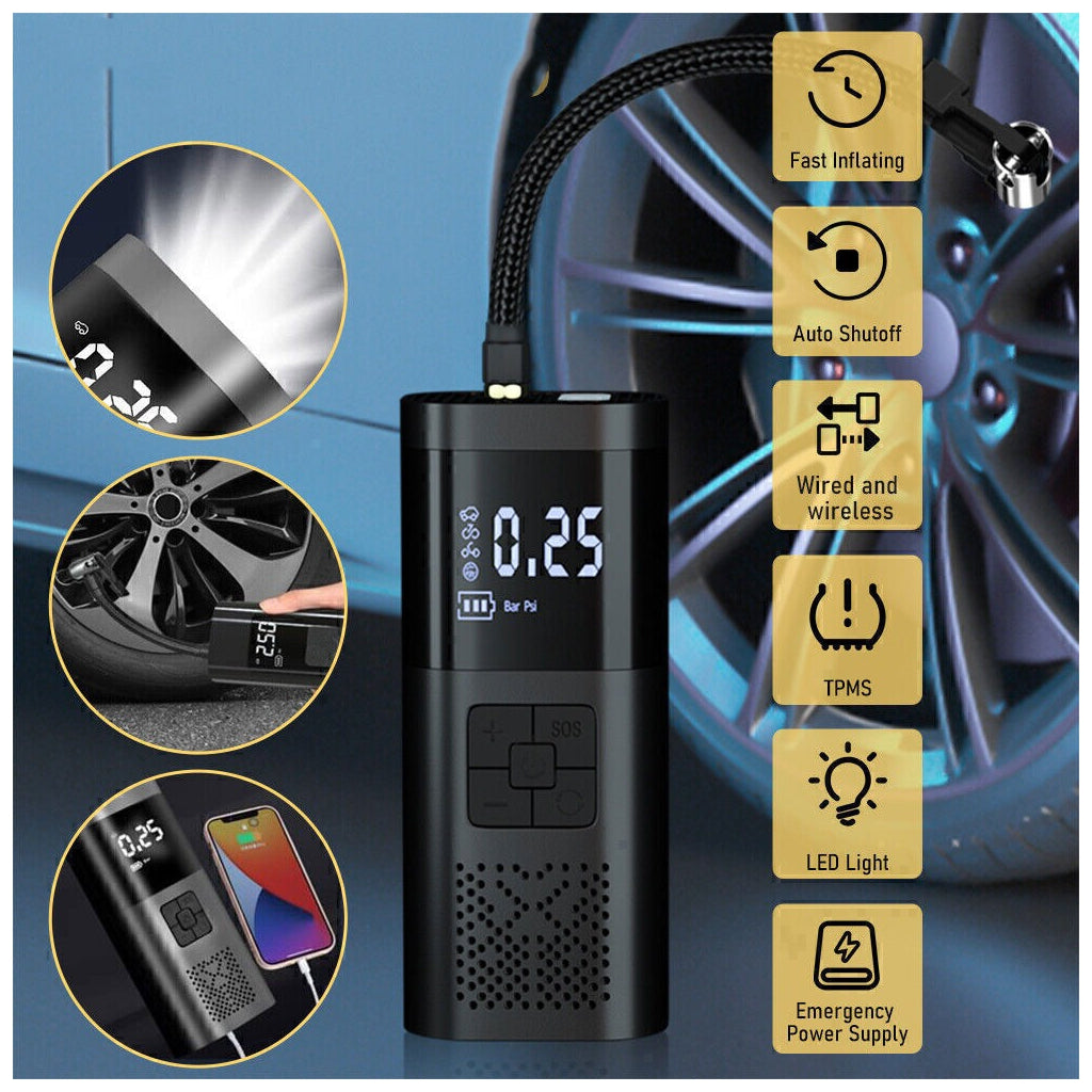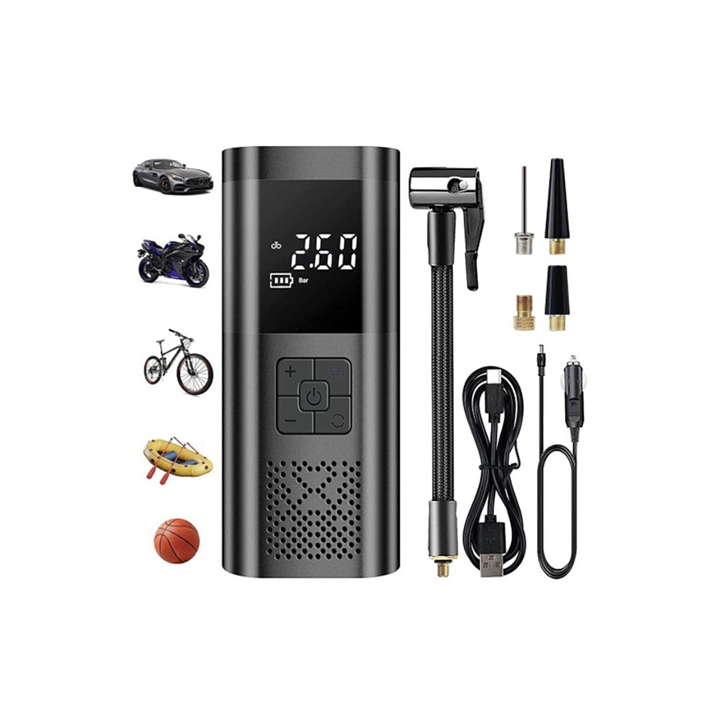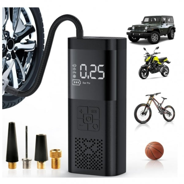 Compressor de Ar Portátil Digital para Carros, Motos e BicicletasTenha sempre os seus pneus calibrados com este compressor de ar portátil e multifuncional. Compacto e leve, é ideal para encher pneus de carros, motos, bicicletas e até bolas desportivas. Perfeito para emergências ou para manter a pressão ideal nos seus pneus.CaracterísticasEcrã digital LED: Exibe a pressão em tempo real, facilitando o controlo preciso.Multifuncional: Inclui adaptadores para pneus, bolas e outros infláveis.Portátil e leve: Fácil de transportar e armazenar no carro ou em casa.Bateria recarregável: Uso sem fios com autonomia prolongada.Função de desligamento automático: Desliga ao atingir a pressão desejada.Iluminação SOS integrada: Útil em situações de emergência.